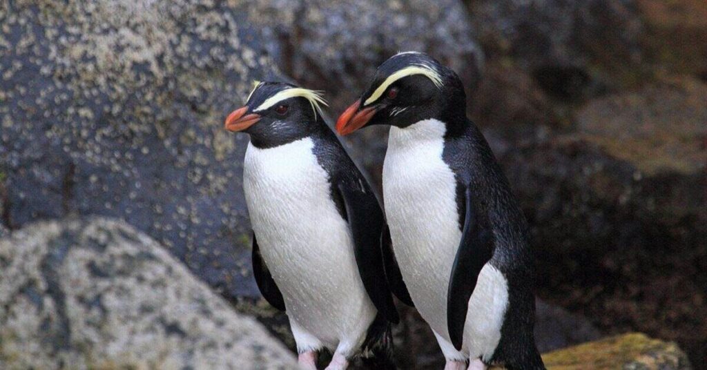 Fiordland Penguins live along the southwestern coasts of New Zealand. They have dark black heads with pale yellow streaks above their eyes. These penguins prefer dense forests and rocky coastlines for nesting. They are shy and usually stay hidden from humans.