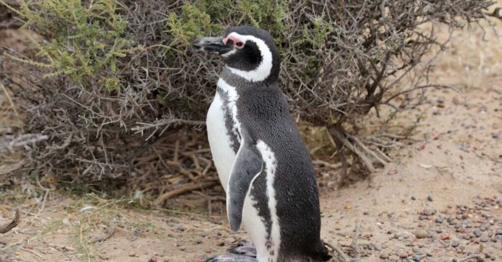 Magellanic Penguins live along the coasts of Argentina, Chile, and the Falkland Islands. They have black backs, white fronts, and two black bands across their chest. These penguins nest in burrows or under bushes to protect their eggs. They often form large colonies near the shore.