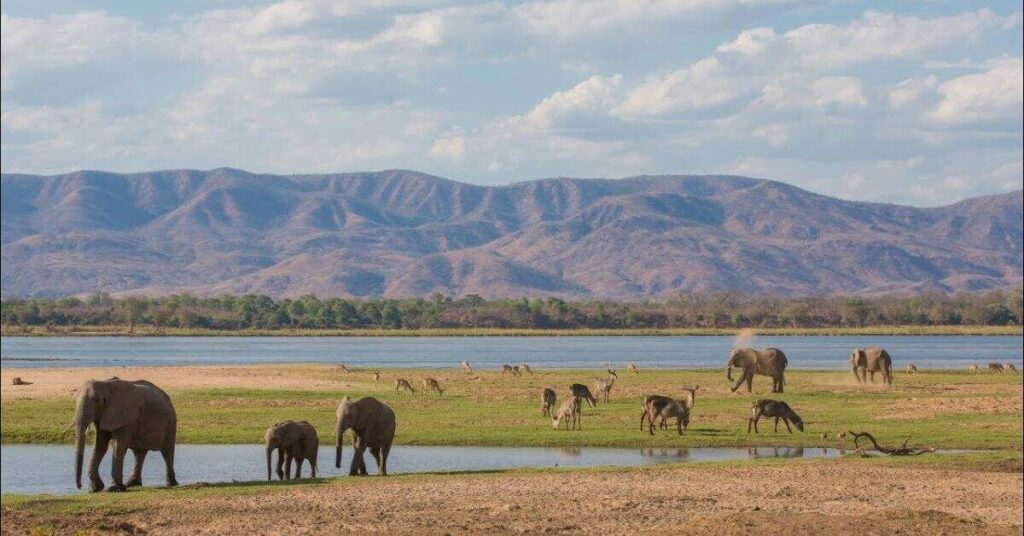 Mana Pools National Park lies along the Zambezi River. It offers close views of animals near water. Elephants walk calmly among trees. Hippos rest in the river. Crocodiles bask on riverbanks.