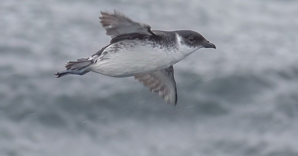 The diving petrel is a small and fast seabird. It has dark feathers on its back and white on its belly. This bird is an excellent swimmer. It uses its wings to dive and catch food underwater. The diving petrel lives near southern oceans and islands. It nests in burrows or crevices on rocky land to stay safe from predators.