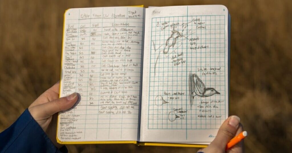 Birders often sketch birds or add notes about bird songs and colors. This practice helps improve observation skills and strengthens their connection with nature.