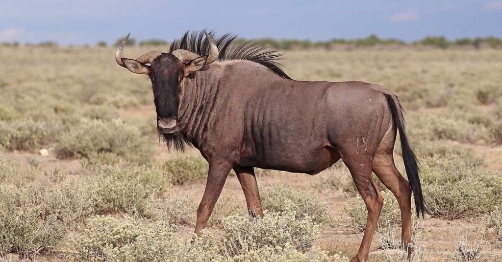 The wildebeest is a large grass eating animal that lives in the open plains of Africa. It has a strong body, curved horns, and a long face that looks a bit like a cow. Its coat is usually gray or brown with dark stripes on the shoulders. Wildebeests live in big herds, which helps them stay safe from predators. They spend most of their time grazing on grass and moving across the savanna.