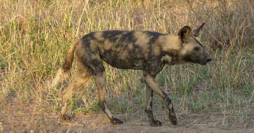 The African wild dog is a smart and fast predator found in parts of Africa. It has a thin body, large rounded ears, and a coat with patches of brown, black, and white. These colorful patterns help it hide in grass and forests. African wild dogs are very social and live in groups called packs. They rely on teamwork to survive and hunt.