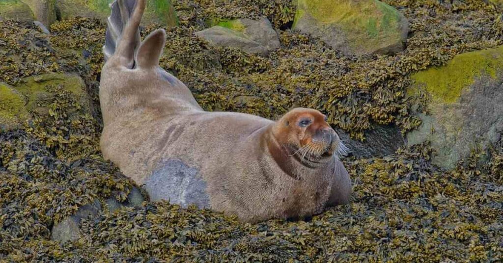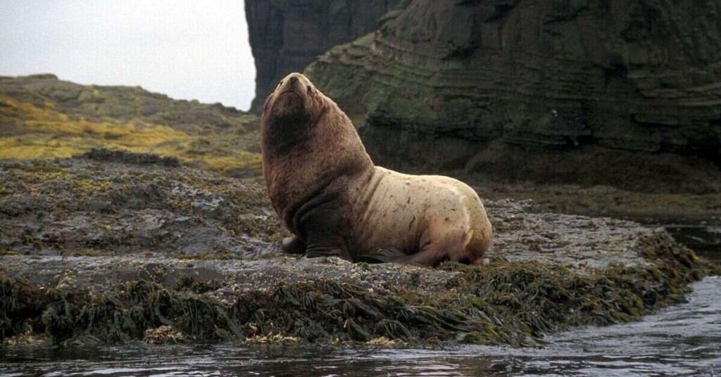 The Steller sea lion is the biggest of all eared seals. Males can grow to be enormous, reaching weights over 2,000 pounds. Females are much lighter at around 600 pounds. These powerful animals live in the cold waters of the North Pacific. You can spot them from northern Japan all the way to central California. They have thick bodies covered in short fur. Their color ranges from light blonde to dark brown. Unlike true seals, they have visible ear flaps on the sides of their heads. They also have large front flippers that help them move on land.