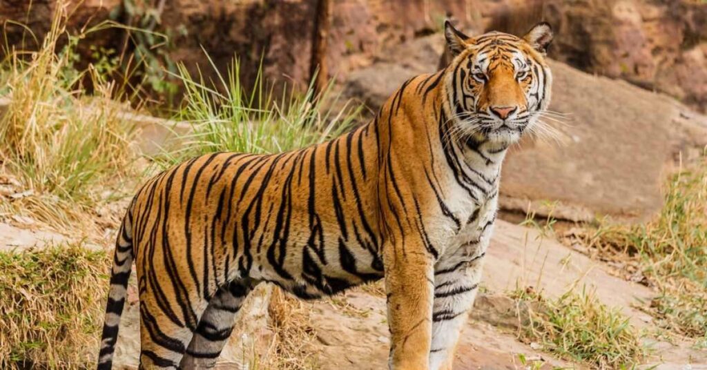The Bengal tiger is the most famous animal in wildlife in India. It is known for its strength and beauty. This tiger has orange fur with black stripes. Each tiger has a unique stripe pattern. Bengal tigers live mainly in forests and grasslands. They need large areas to hunt and survive.