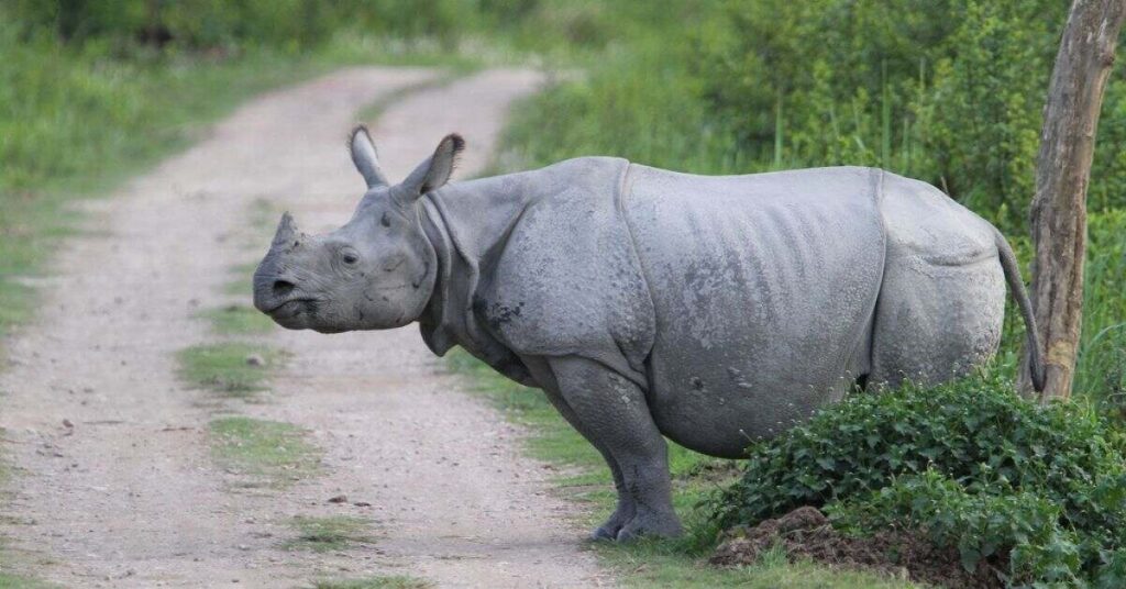 The Indian rhinoceros is a powerful animal in wildlife in India. It has thick skin that looks like armor. This rhino lives near rivers and grasslands. It feeds on grass, leaves, and plants. The one horn on its nose makes it easy to recognize.